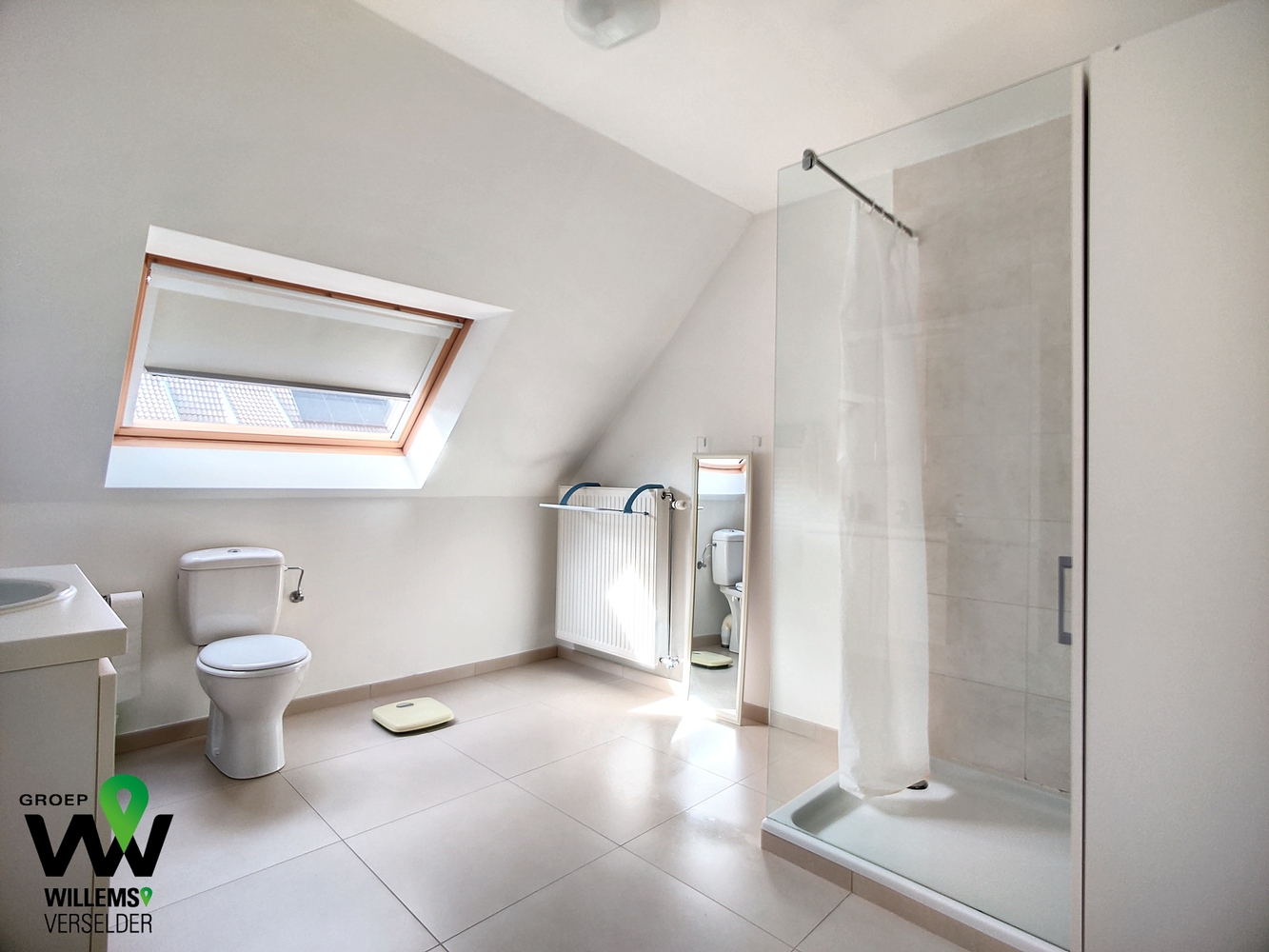 – ruime badkamer voorzien van inloopdouche, toilet en badkamermeubel